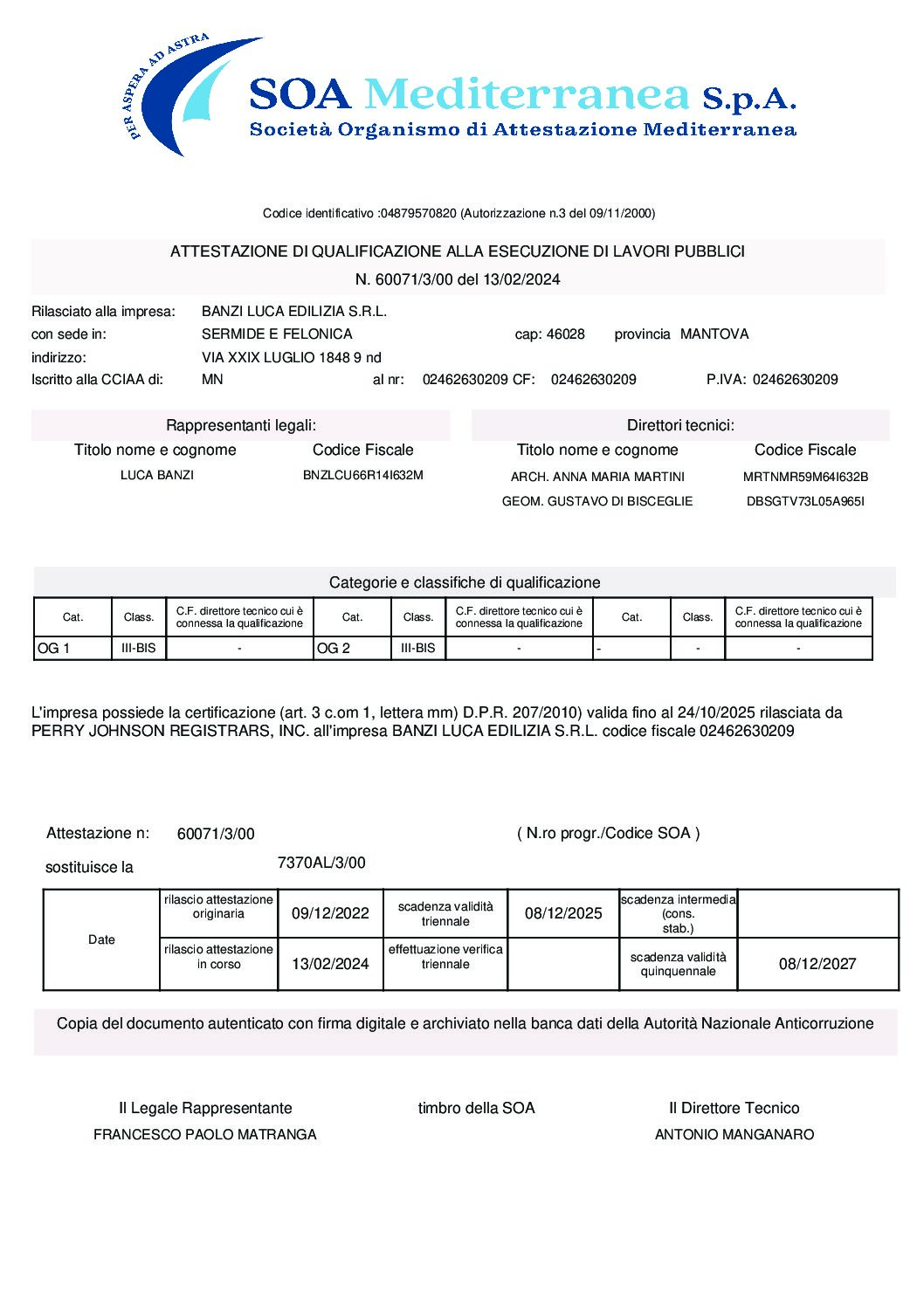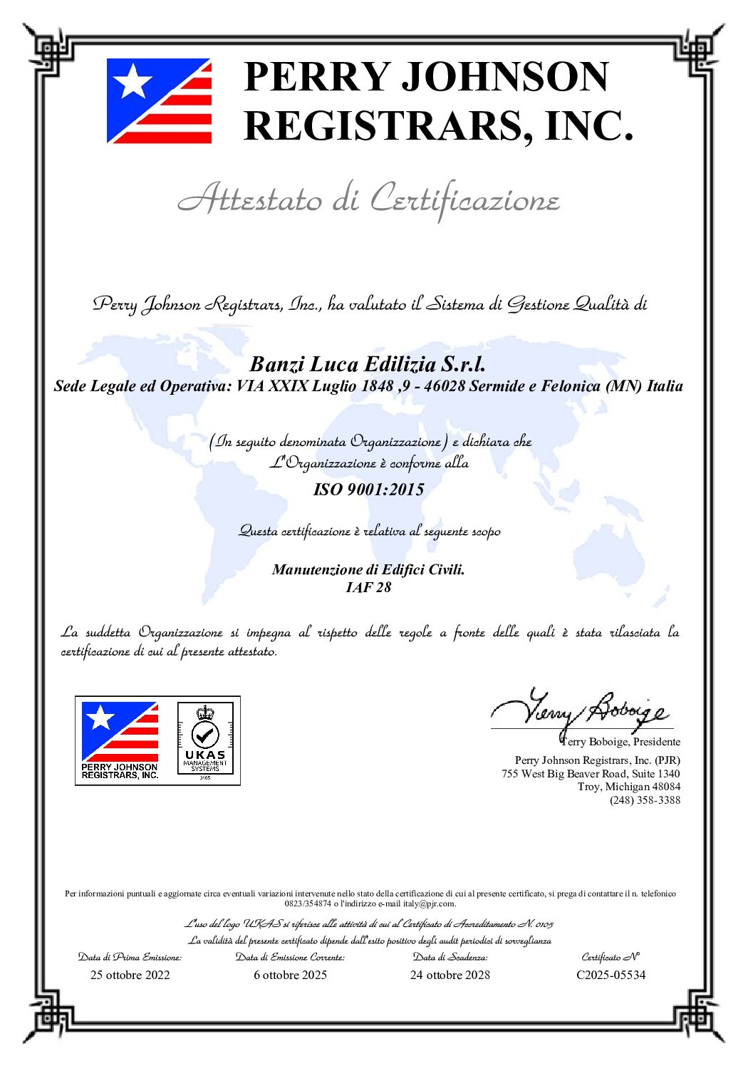 La nostra impresa edile si fa continuamente garante di qualità e sicurezza e lo dimostra grazie alle certificazioni che ottiene, in particolare la ISO 9001-2015 e l’attestazione SOA nelle categorie OG1 e OG2. La prima dichiara ai clienti che Banzi Luca Edilizia soddisfa i requisiti qualitativi minimi richiesti dal Sistema di Gestione per la Qualità. Quest’ultima si pone l’obiettivo di cambiare il mercato globale e tecnologico, rinforzando il sistema della gestione del rischio. La seconda, invece, attesta l’azienda al monitoraggio, alla manutenzione e al restauro di beni culturali immobili, avendo anche la possibilità di realizzare anche impianti aggiuntivi, accessori e complementari degli edifici.